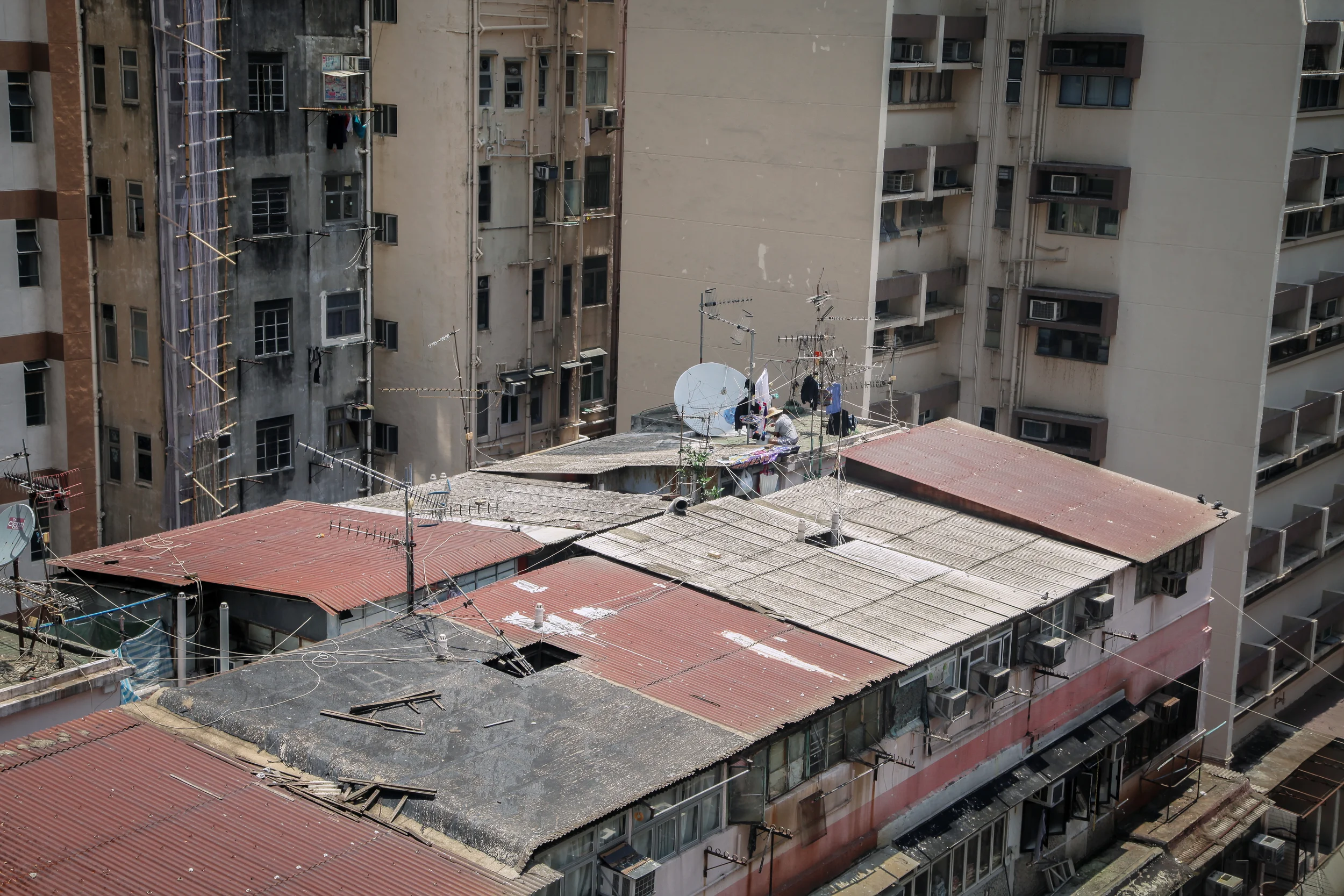 an artist community in the foo tak building, wedged in-between the other 唐樓 buildings in wanchai, hong kong. a sticker on the elevator wall declares: "the land belongs to the people". perhaps reflecting the demands of the former residents choi yuen village, and many other areas who have faced displacement on the outer areas in hong kong over the years, due to development fueled by politics and corporate interests.